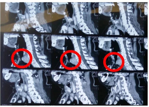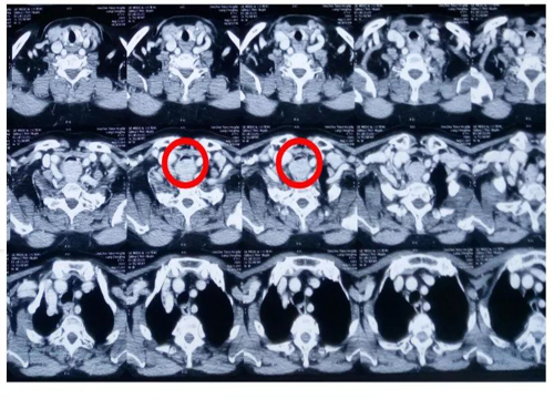 患者甲状腺乳头状癌术后核素治疗后复发侵犯气管和食管,至气管狭窄呼吸困难,伴有声音嘶哑。