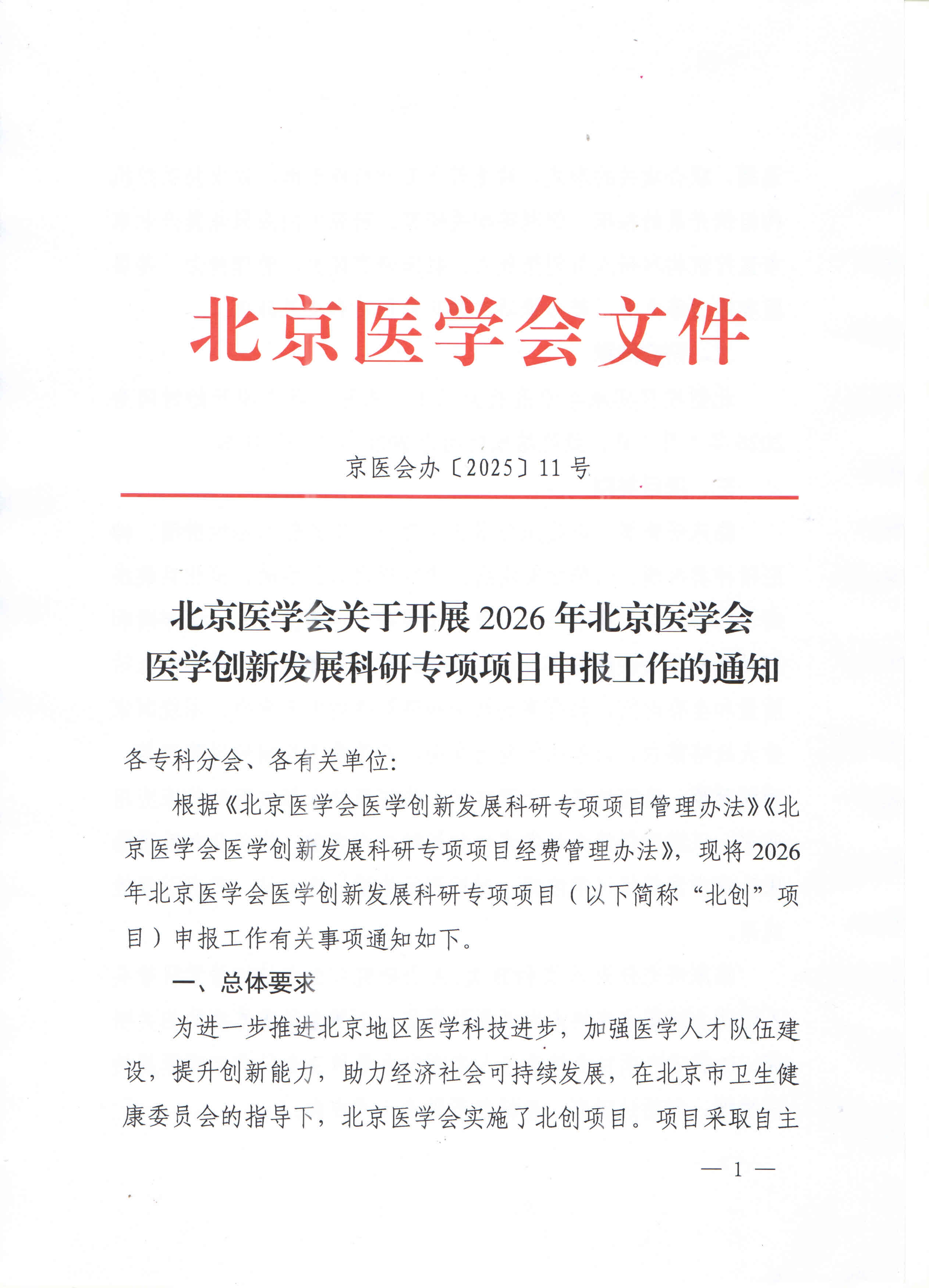 北京医学会关于开展2026年北京医学会医学创新发展科研专项项目申报工作的通知