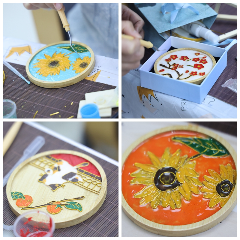掐丝珐琅(景泰蓝)发祥于北京,是珐琅技艺与中国本土金属工艺融合的经典之作,经打胎、掐丝、点蓝等繁复工序方能成型,尽显传统工艺的精妙与雅致。活动现场,大家带着对非遗技艺的好奇与期待,早早到场签到。在制作讲解环节,大家认真聆听掐丝珐琅的工艺渊源与制作要点,细致学习镊子、剪刀等工具的使用技巧。实操过程中,女职工们凝神聚力、巧手翻飞,从掐丝粘胶到点蓝填色,每一道工序都一丝不苟。遇到操作难题时,大家相互交流、彼此支招,现场氛围热烈而温馨。欢声笑语间,原本零散的铜丝和釉料,渐渐化作一件件独具匠心的掐丝珐琅杯垫,也承载着大家对生活的美好期许。
